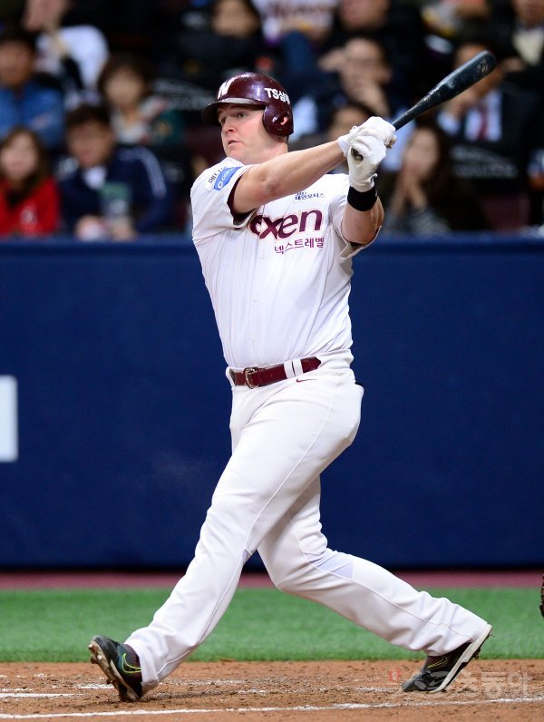 4회말 1사 1루에서 넥센 샌즈가 SK 선발 문승원을 상대로 좌월 투런 홈런을 쏘아 올리고 있다.