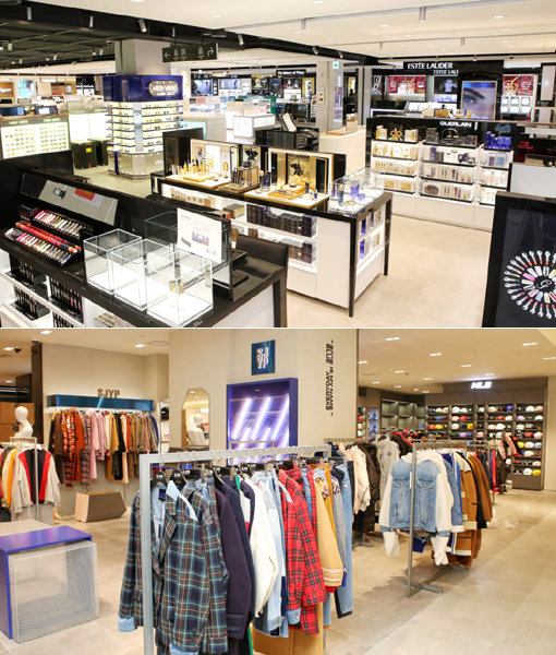 1일 서울 삼성동 무역센터점에 오픈하는 현대백화점면세점 9층 뷰티&패션관(위쪽)과 10층 라이프스타일관 내 SJYP 매장. 현대백화점면세점의 오픈으로 ‘유통 빅3’인 롯데, 현대, 신세계가 면세점 ‘강남 벨트’를 형성하며 맞붙게 됐다. 사진제공|현대백화점면세점