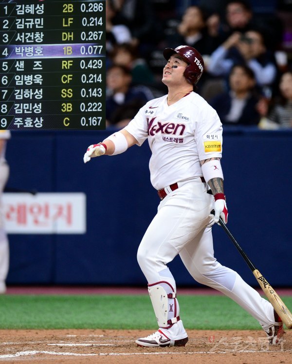 8회말 무사에서 넥센 박병호가 플라이 타구를 날리고 있다.