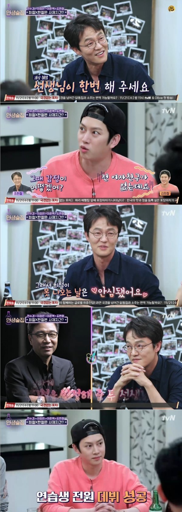 이날 조한철은 김희철이 연습생이던 시절 SM엔터테인먼트에서 연기 선생님으로 있었다고 고백했다. 그는 “김희철을 포함해 중고등학생 연습생들을 2년 정도 가르쳤다. 지금도 김희철을 보면 방송에서 맥락 없는 이야기를 많이 하지 않나. 당시에도 연기를 위해 상황을 설명해주면 맥락 없이 ‘선생님이 한 번 해주세요’라고 했다. 너무 천진난만하게 이야기하니까 할 뻔 했다”고 말했다. 그러면서 “희철이가 못 나오는 날에는 안심됐다”고 덧붙였다.