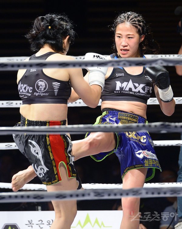 박성희가 우먼 챔피언십에서 김효선(왼쪽)에게 발차기를 하고 있다.