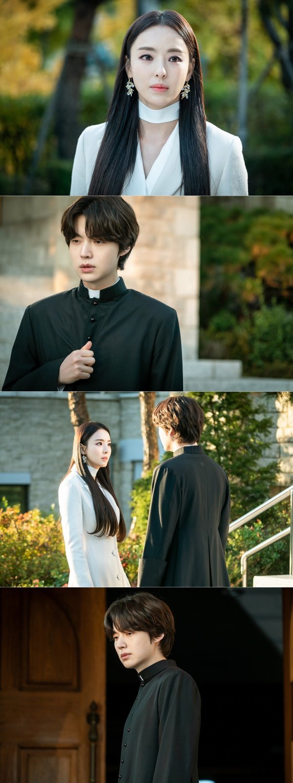 공개된 사진 속 강사라와 류은호의 애틋한 표정이 눈길을 끈다. 류은호는 꿈에 그리던 사제복을 입고 성스러운 분위기를 자아내고 있다. 류은호를 찾아온 강사라는 슬픔이 가득한 표정. 어떤 상황에서도 쉽게 감정을 드러내지 않았던 강사라의 눈빛에는 미련과 상처가 흘러넘친다. 부모님의 반대에도 꿈을 굽히지 않았던 류은호의 예상 밖 흔들리는 표정도 궁금증을 자극한다. 강사라에게 상처를 준 게 못내 괴로운 듯 가슴까지 부여잡은 류은호. 사제복의 무게와 강사라를 향한 마음 사이에서 갈등하는 듯한 그의 모습이 안타까움을 자아낸다. 부서지는 햇살 아래 그림 같은 강사라와 류은호. 신을 사이에 둔 두 사람의 운명은 더욱더 애틋해진다.