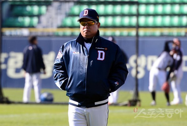 4일 서울 잠실야구장에서 ‘2018 신한은행 마이카 KBO리그’ 두산 베어스와 SK 와이번스의 한국시리즈 1차전 경기가 열린다. 경기에 앞서 두산 김태형 감독이 선수들의 훈련을 지켜보고 있다.