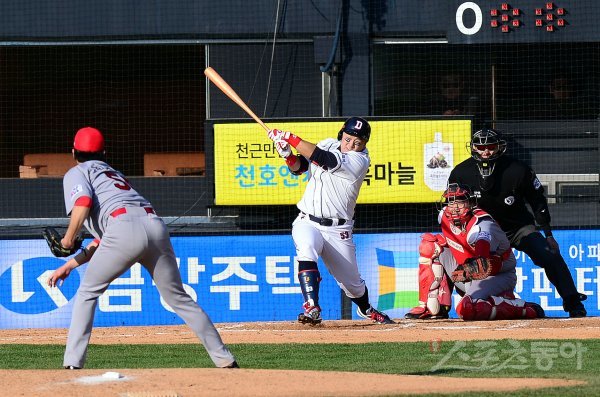 4일 서울 잠실야구장에서 ‘2018 신한은행 마이카 KBO리그’ 두산 베어스와 SK 와이번스의 한국시리즈 1차전 경기가 열렸다. 3회말 2사 1, 3루에서 두산 최주환이 1타점 적시타를 날리고 있다.