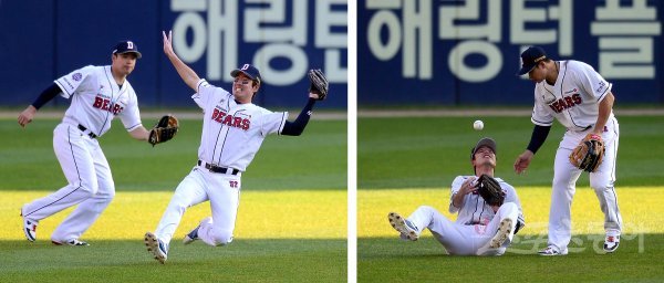 6회초 2사 두산 김재호가 SK 김성현의 뜬공을 잡고 있다.