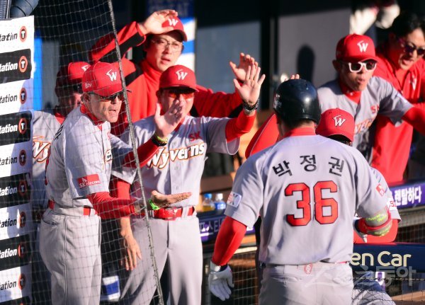 6회초 1사 1루 SK 박정권이 다시 앞서가는 우월 투런 홈런을 날리고 그라운드를 돌아 홈인해 힐만 감독의 축하를 받고 있다.