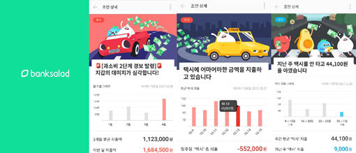 뱅크샐러드의 ‘금융비서’(사진)는 택시비, 카페, 온라인쇼핑 등 다양한 지출영역에서 밀착 관리를 받을 수 있다. 택시비 지출이 커지면 ‘택시에 어마어마한 금액을 지출하고 있습니다’는 경고 메시지가 뜨고, 지출이 줄면 ‘이번 주에는 택시를 안 타고 1만원을 아꼈습니다’ 등의 칭찬 알림이 울린다.
