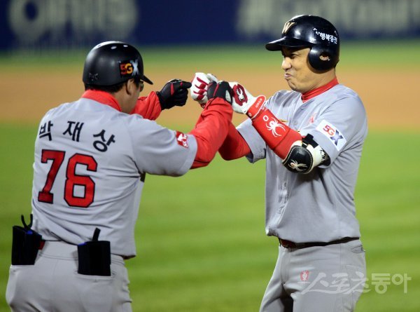 7회초 2사 2, 3루에서 SK 김강민이 2타점 적시타를 날린 뒤 박재상 코치의 환영을 받고 있다.
