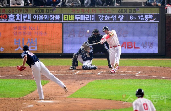 SK 로맥이 1회말 1사 1,2루에서 두산 선발 이용찬을 상대로 스리런 홈런을 치고 있다.