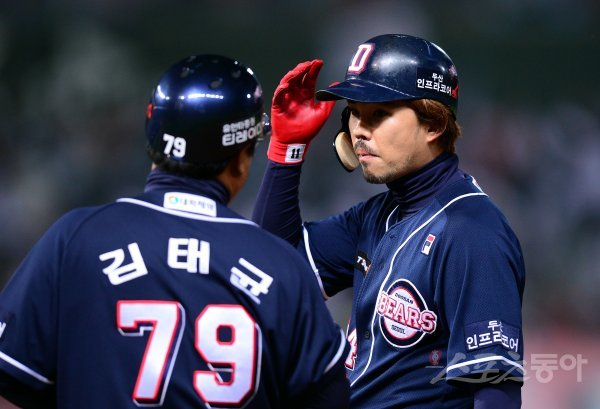 5회초 2사 2루에서 두산 오재원이 1타점 적시타를 날린 뒤 김태균 코치의 격려를 받고 있다.