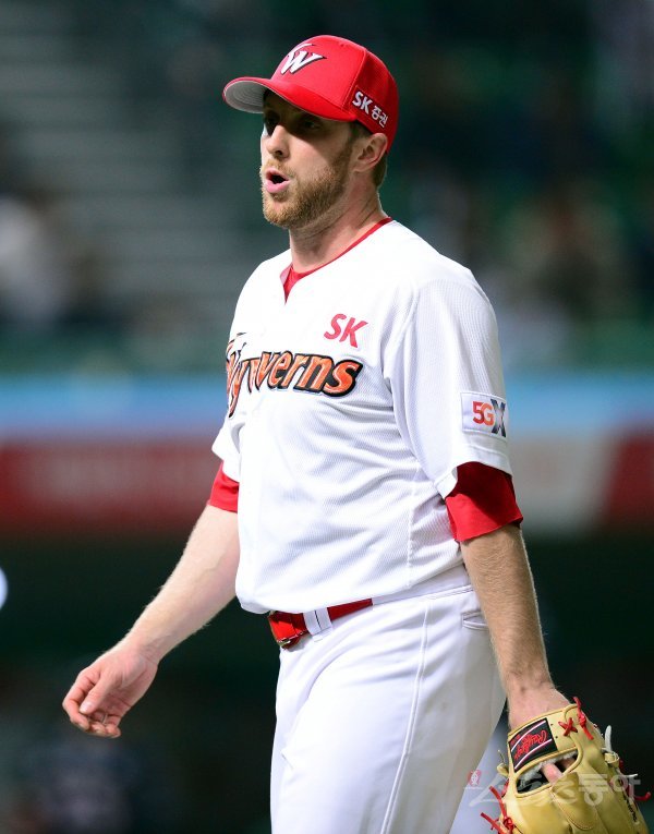 4회까지 무실점으로 두산 공격을 막은 SK 선발 켈리가 이닝 종료 후 더그아웃으로 향하고 있다.
