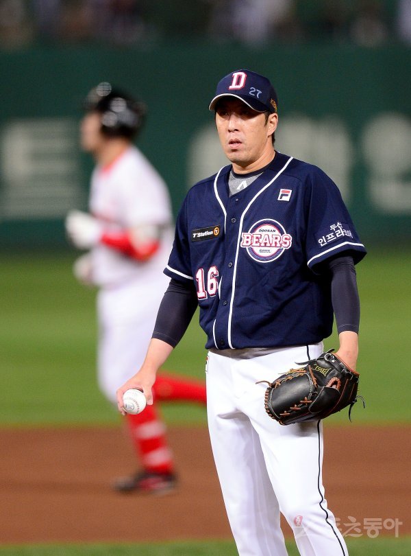8회말 무사 1루 두산 김승회가 SK 이재원에게 중월 투런 홈런을 허용한 후 아쉬워하고 있다.