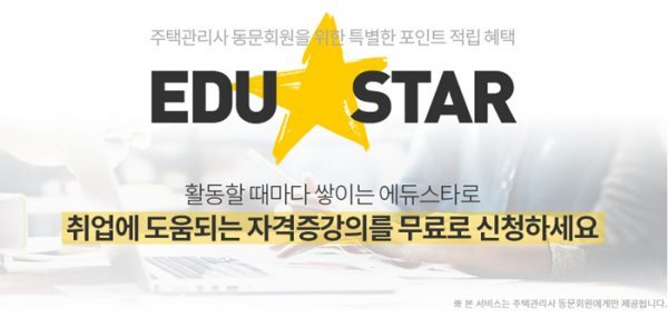 특히 자사 주택관리사 동문회원을 위한 특별한 포인트 적립 혜택을 운영하고 있다. 바로 취업지원센터의 ‘에듀스타’다. 에듀윌 주택관리사 취업지원센터 홈페이지를 이용하면 저절로 쌓이는 포인트로 취업에 도움이 되는 자격증 강의를 무료로 신청할 수 있다.
