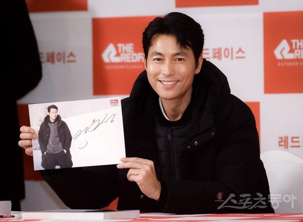 배우 정우성이 8일 경기도 부천시 홈플러스 부천상동점에서 열린 아웃도어 브랜드 레드페이스의 신제품 ‘정우성 롱패딩’ 출시 기념 사인회에 참석해 포토타임을 갖고 있다.