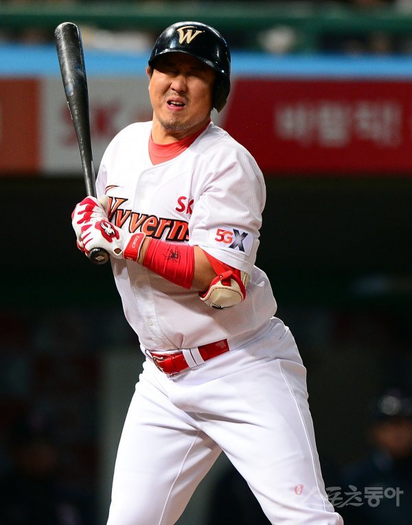SK 최정이 3회말 1사 1,2루에서 두산 선발 린드블럼이 던진 공에 맞고 고통스러워 하고 있다.