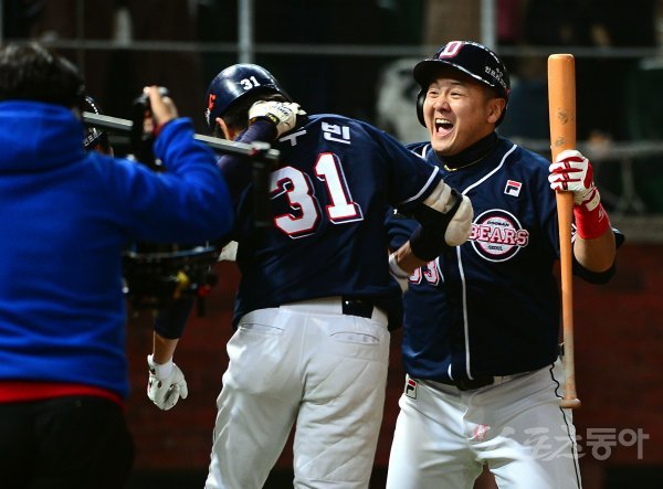 두산 최주환이 8회초 1사 1루에서 SK 선발 산체스를 상대로 역전 투런홈런을 치고 홈을 밟은 정수빈을 보며 환호하고 있다.