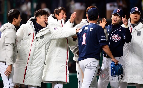 경기 후 두산 마무리 함덕주가 선수들과 기쁨을 나누고 있다.