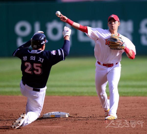 10일 인천 SK행복드림구장에서 두산베어스와 SK와이번스가 맞붙는 ‘2018 신한은행 MY CAR KBO리그’ 한국시리즈 5차전 경기가 열렸다. 2회초 무사 1루 두산 박건우 내야 땅볼 때 SK 강승호가 1루주자를 포스 아웃시킨 후 1루로 송구하고 있다. 인천 | 김종원 기자 won@donga.com