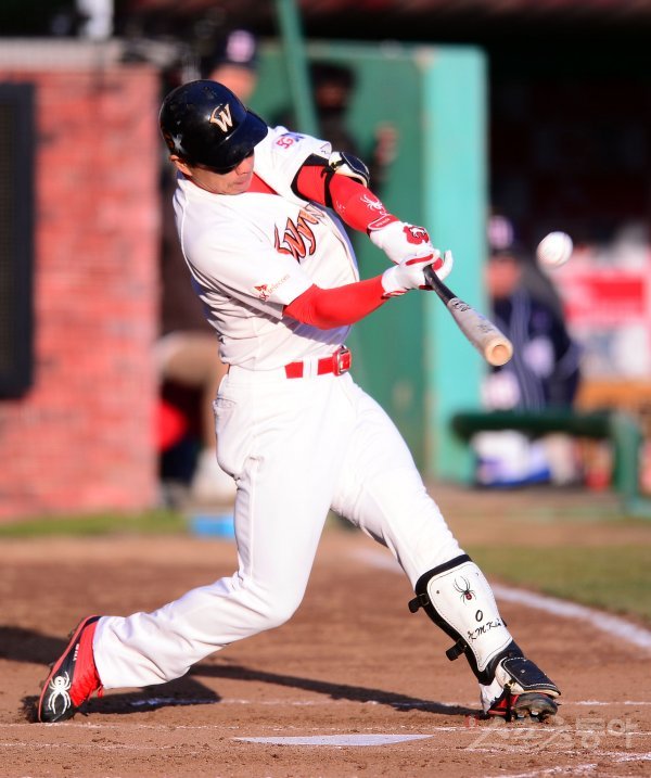 10일 인천 SK행복드림구장에서 두산베어스와 SK와이번스가 맞붙는 ‘2018 신한은행 MY CAR KBO리그’ 한국시리즈 5차전 경기가 열렸다. 7회말 1사 3루 SK 김강민이 역전 1타점 외야플라이를 치고 있다. 인천 | 김종원 기자 won@donga.com