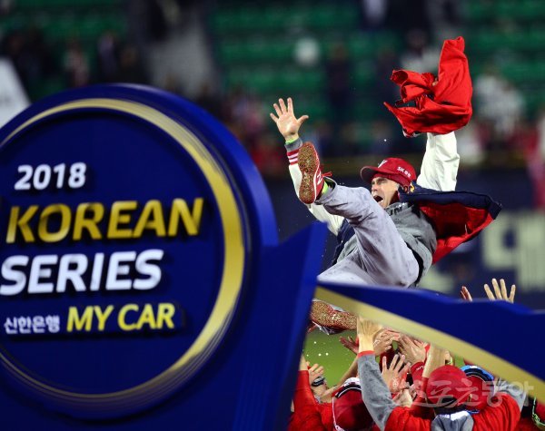 시리즈 전적 4승 2패로 우승을 차지한 SK 선수들이 힐만 감독을 헹가래 치고 있다.