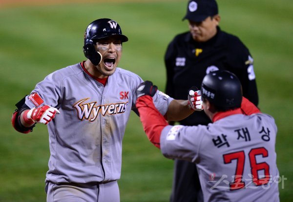 12일 서울 잠실야구장에서 SK와이번스와 두산베어스가 맞붙는 ‘2018 신한은행 MY CAR KBO리그’ 한국시리즈 6차전 경기가 열렸다. 연장 13회초 2사 SK 한동민이 우중월 솔로 홈런을 날리고 그라운드를 돌며 환호하고 있다.