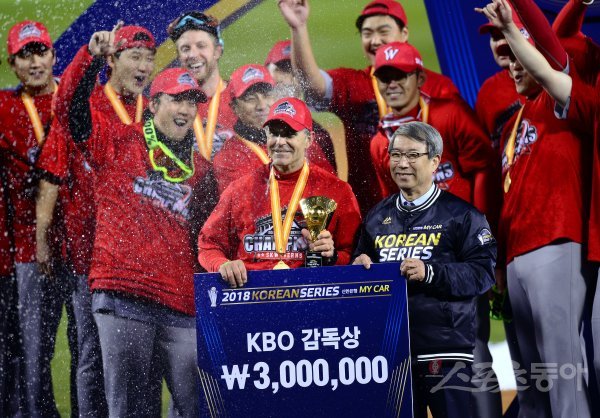 12일 서울 잠실야구장에서 열린 SK와이번스와 두산베어스가 맞붙는 ‘2018 신한은행 MY CAR KBO리그’ 한국시리즈 6차전 경기에서 SK가 시리즈 전적 4승 2패로 우승을 차지헸다. 감독상을 수상한 힐만 감독이 기념촬영을 하고 있다.