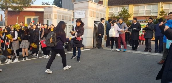 학생들의 긴장을 풀어줄 핫팩과 함께 따뜻한 응원의 메시지를 전하며 기운을 불어넣어 주었다. 열띤 응원에 해마다 찾아오던 수능 한파도 비켜간 듯했다.