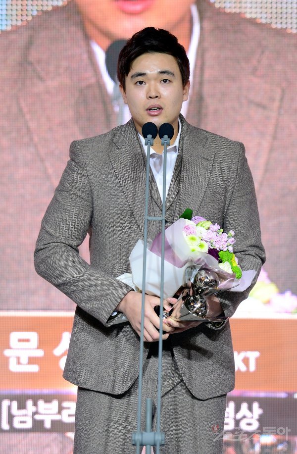 올 시즌 최고의 활약을 펼친 KBO 최우수선수(MVP)와 최우수신인선수를 선정하는 『2018 신한은행 MY CAR KBO 시상식』이 19일(월) 르메르디앙 서울에서 열렸다. 퓨처스리그 남부 홈런상과 타점상을 수상한 문상철이 수상 소감을 말하고 있다.