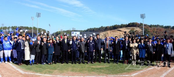 이대호 홍보대사, 오규석 기장군수, 이성춘 스포츠동아 상무 및 내 외빈들이 참가 선수들과 기념촬영을 하고 있다.