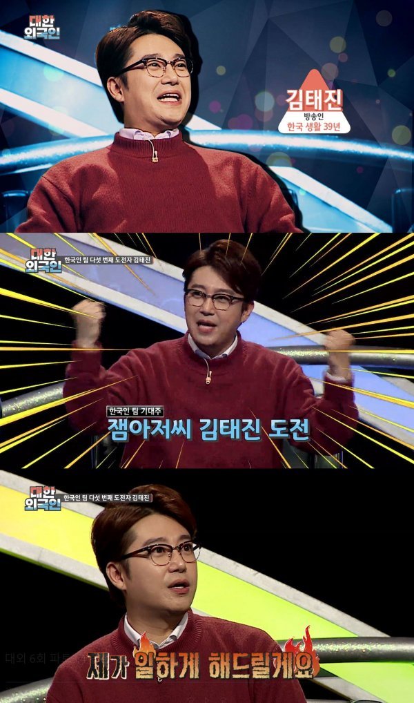 퀴즈쇼 진행을 통해 일명 '잼아저씨'로 불리며 직장인들의 점심시간을 사로잡고 있는 그가 '대한외국인'에 도전장을 내밀었다. 김태진은 "동시접속 23만 명에 육박하는 퀴즈쇼를 진행 중이다. 퀴즈 문제의 절반은 내가 출제 한다"며 퀴즈 대결에 대한 강한 자신감을 드러냈다. 이에 샘 오취리는 "퀴즈를 내는 입장과 푸는 입장은 다르다"고 반박하며 만만치 않은 대결이 될 것임을 예고했다.