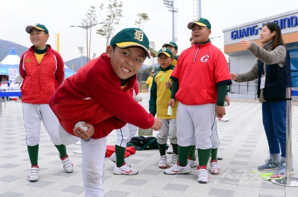 MLB로드쇼를 찾은 부산 대연초등학교 야구선수들이 투구 스피드를 측정하고 있다.