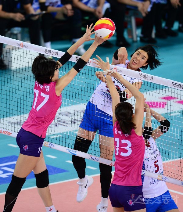 21일 인천계양체육관에서 열린 ‘2017-18 도드람 V리그’ 여자부 한국도로공사와 흥국생명 경기에서 한국도로공사 정대영이 흥국생명의 블로킹 사이로 스파이크 공격을 하고 있다.