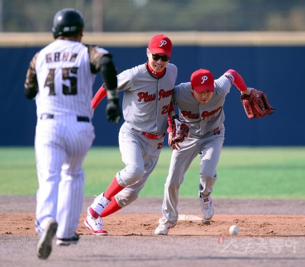 사회인부 초콜릿과 플러스파워 경기에서 2회초 무사 1루 플러스파워 배재호와 김석구가 놓치 공을 잡으러 달려가고 있다.