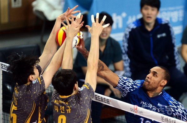 우리카드 아가메즈의 공격을 KB손해보험 손현종과 이선규가 블로킹하고 있다.