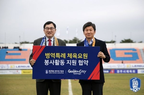 대한축구협회(KFA)가 정몽규 대한축구협회장과 주낙영 경주시장이 지난 24일(토) ‘2018 K3리그 어드밴스 챔피언십 결승 2차전’이 펼쳐진 경주시민운동장에서 '병역특례 체육요원 봉사활동 지원’에 대한 협약을 체결했다고 밝혔다.