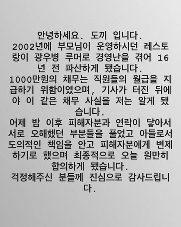 그는 “2002년에 부모님이 운영하시던 레스토랑이 광우병 루머로 경영난을 겪어 16년 전 파산하게 됐다”고 운을 뗀 후 “1000만원의 채무는 직원들의 월급을 지급하기 위함이었으며, 기사가 터진 뒤에야 이 같은 채무 사실을 알게 됐다”고 말했다.
