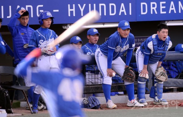 중등부 경남중학교와 사직중학교 경기에서 사직중 선수들이 응원을 하고 있다.