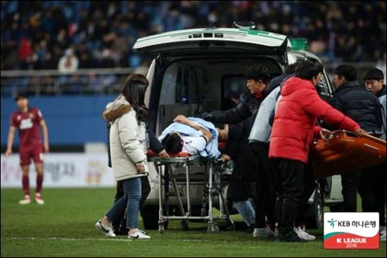 이승모는 28일 오후 대전월드컵경기장에서 열린 대전시티즌과의 KEB하나은행 K리그2 준플레이오프에 출전해 전반 3분 부상을 입고 쓰러졌다.