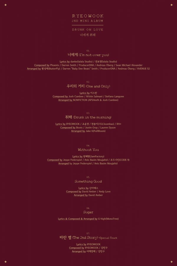 려욱은 오늘(30일) 낮 12시 인스타그램, 트위터, 페이스북, 웨이보 등 슈퍼주니어의 공식 SNS를 통해 두 번째 미니앨범 트랙리스트를 오픈, 이번 앨범에는 타이틀 곡 ‘너에게 (I’m not over you)’와 지난 28일 선공개 된 수록곡 ‘우리의 거리 (One and Only)’는 물론, ‘취해 (Drunk in the morning)’, ‘Without You’, ‘Something Good’, ‘Sugar’, ‘파란 별 (The 2nd Story)’까지 총 7곡이 다채롭게 수록돼, 려욱의 진한 음악적 감수성을 느낄 수 있다.