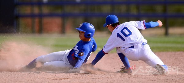 중등부 결승 대동중과 원동중 경기 6회초 무사 1루 대동중 유승진이 2루 도루를 시도했으나 아웃되고 있다.
