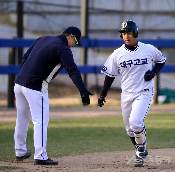 고등부 결승 대구고와 개성고 경기 6회초 1사 대구고 박형준이 좌월 솔로 홈런을 날리고 그라운드를 돌며 하이파이브 하고 있다.