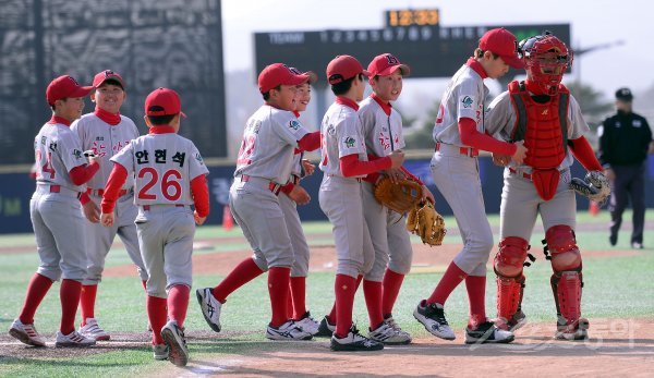 리틀부 결승 함안군 리틀야구단과 양산시 리틀야구단 경기에서 9-5 승리를 거두며 우승을 차지한 함안군 선수들이 기뻐하고 있다.