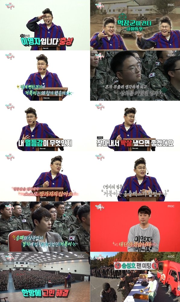 이영자는 강연을 앞두고 “자료조사도 했는데 다 날아갔다”고 걱정했던 것도 잠시 “이영자입니다. 충성!”이라고 카리스마 넘치는 인사로 강연을 시작했다. 장병들을 위해 특별히 떡볶이와 순대를 준비했다고 밝힌 이영자는 특유의 먹방 ASMR로 분위기를 고조시켰다.