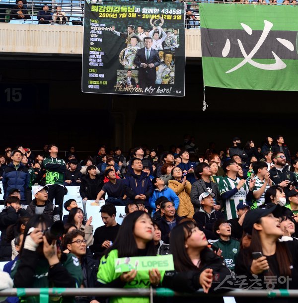 2일 전북 전주월드컵경기장에서 열린 ‘KEB하나은행 K리그1 2018’ 전북 현대와 경남 FC의 경기가 열렸다. 중국으로 떠나는 전북 최강희 감독이 고별전 경기에 앞서 전북 축구팬들이 응원하고 있다.