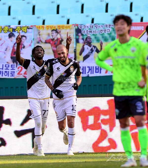 경남 네게바가 동점골을 성공한 뒤 환호하고 있다.