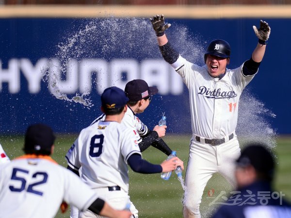 사회인부 3부 결승 덜백스와 대흥브라더스 경기 연장 8회말 1사 1,3루 덜백스 서대윤이 끝내기 안타를 치고 팀 동료들과 기뻐하고 있다.