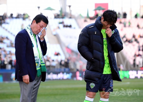 중국으로 떠나는 전북 최강희 감독의 고별 경기가 종료된 뒤 최강희 감독이 이동국과 작별을 나누고 눈물을 흘리고 있다.