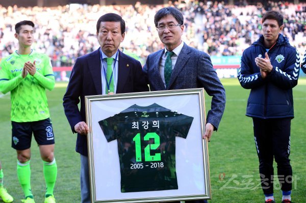 중국으로 떠나는 전북 최강희 감독의 고별 경기가 종료된 뒤 최강희 감독이 백승권 단장으로부터 기념 유니폼을 전달받고 기념촬영을 하고 있다.