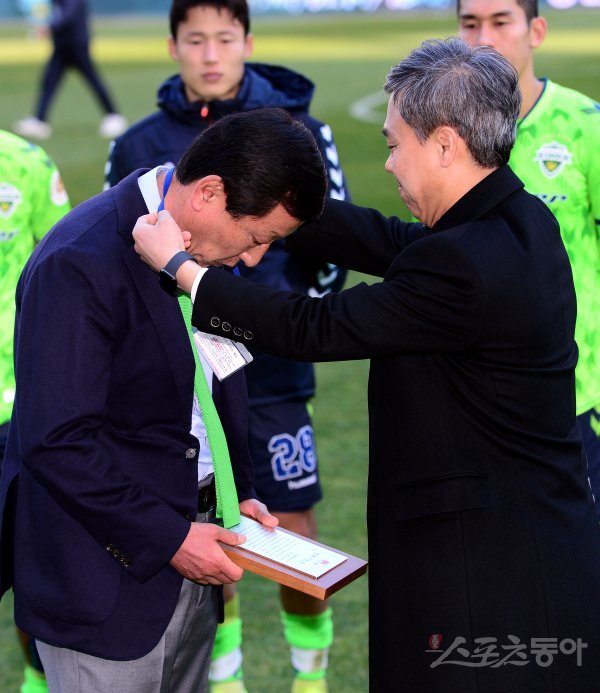 중국으로 떠나는 전북 최강희 감독의 고별 경기가 종료된 뒤 최강희 감독이 김승수 전주시장으로부터 명예시민증을 전달받고 있다.