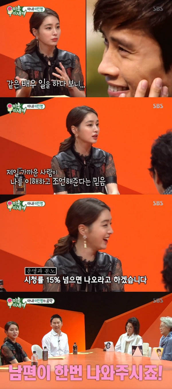 이민정은 2일 방송된 SBS ‘다시 쓰는 육아일기-미운 우리 새끼’(이하 ‘미운 우리 새끼’)에서 남편 이병헌을 드라마 시청률 공약으로 내걸었다.